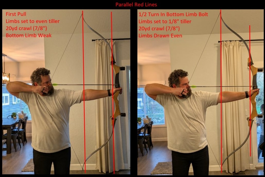 That said, your best tiller will still require effort to find. I highly recommend analyzing your tiller using the bow tuning guide on the Backwoods Composites website. Essentially, you want to make sure that at your ideal average crawl, the bow does not move into your palm or web while drawing. It should pull evenly and without excessive movement, wherever you prefer your grip pressure to be (a subject for another time). Tiller is something you should feel, and as a beginner it can feel abstract, but it is important feedback you need to build awareness around. We can measure tiller statically with a bow square while the bow is strung, but it is also helpful to analyze it at full draw, either with a draw board or by having someone take a side-profile photo. Then, by drawing parallel reference lines between the riser and limb tips, it becomes very clear which limb is too strong or too weak. In one example photo, even with a 1″ crawl, positive tiller was needed to time the limbs correctly. To make things more complicated, these static measurements are only scratching the surface. What the limbs do when we actually let go of the string is the truest test.